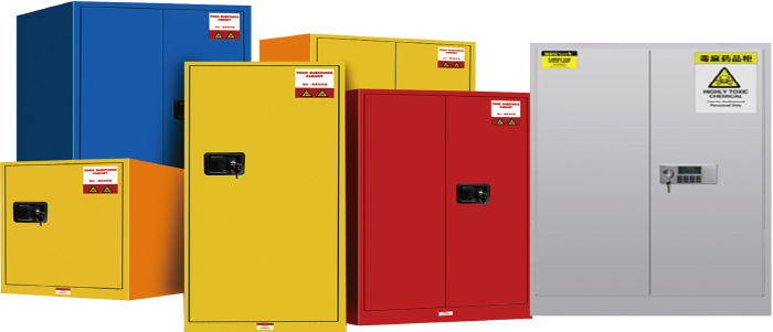 高性能安全柜达到OSHA标准,符合NFPA第30条规定的要求用于规范存储易燃易爆液体及危险化学品安全柜整体为双层防火钢板构造,两层钢板之间间隔40mm,内填特种防火材料,防火性能更为卓越。整体采用采用优质冷轧钢板,增加强度,防火性能更好。柜身底部50mm高的防漏液槽最大可能的防止化学液体的外溢。独有的镀锌层板,防腐蚀,防液漏,最大可承托400lbs的钢制安全罐;柜体内外都喷涂有持久的,无铅的环氧树脂漆,最大程度的增加抗化学品的能力;标有三种语言的高可见度标签,耐腐蚀。两个可带有防火装置的通风口,分别位于柜身的两侧;四个可调节水平支架,确保柜体稳固;严格按照OSHA规范,柜子设有静电接地传到端口,方便连接电接地导线。