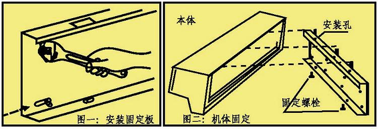 | 安装底板地安装方法:如安装在混凝土墙上,根据安装底板上留的孔的位置,在混凝土墙上冲孔,用8至10的膨胀螺丝预埋在水泥孔中,然后将底板固定其上,整机然后挂在安装底板上,注意挂脚的位置对齐就可以了,最后用螺丝把整机与底板固定。 |