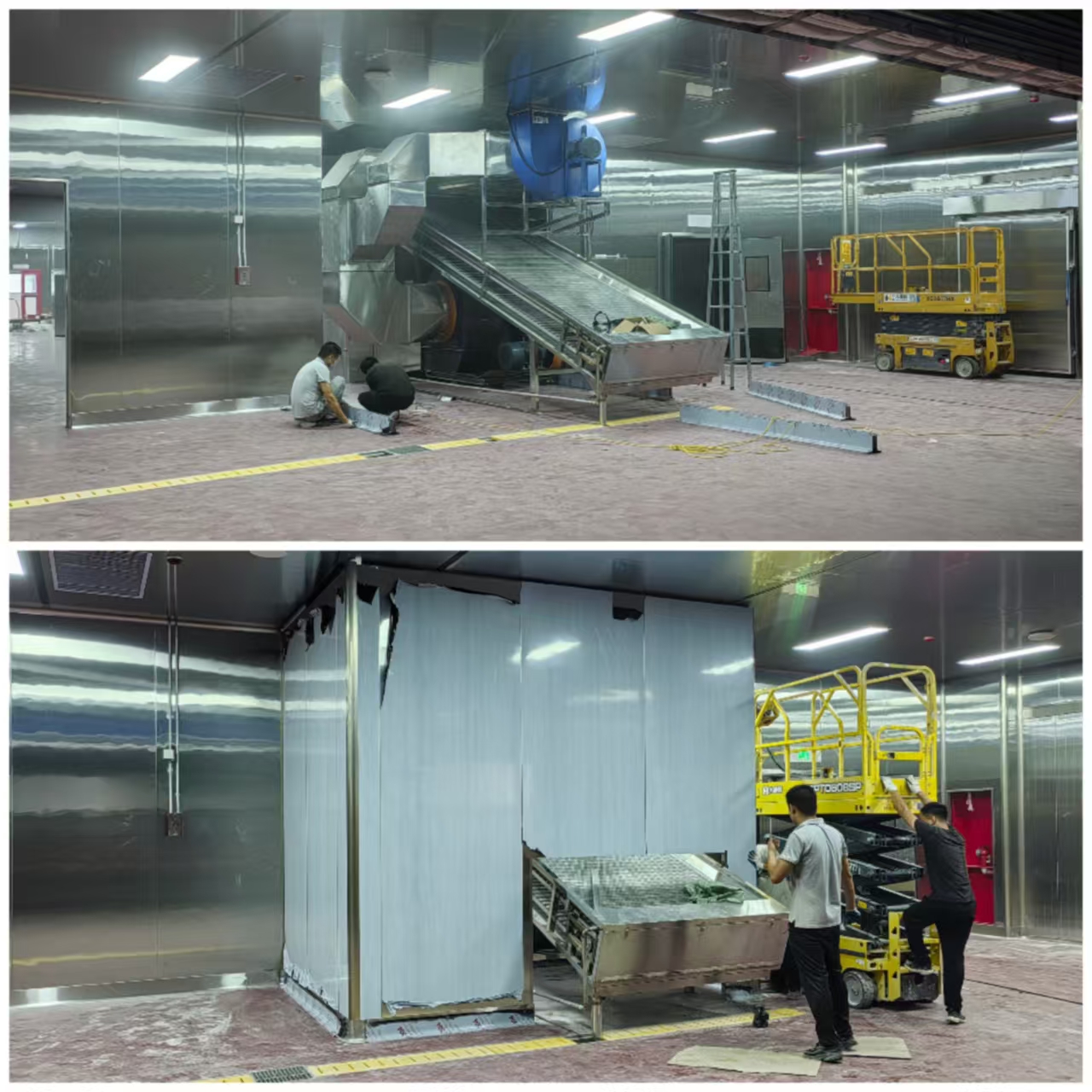 本项目为安徽黄山中央厨房净化车间系统安装工程,2025年4月启动施工,历时6个月交付。工程重点采用彩钢板搭建通用洁净区域,在高湿、高清洁需求的核心工段选用不锈钢彩钢板,提升耐腐蚀、易清洁与抗菌性能。施工内容涵盖净化围护、高效过滤、风淋传递、压差控制及整体密封处理,全面满足中央厨房洁净生产与卫生验收要求。